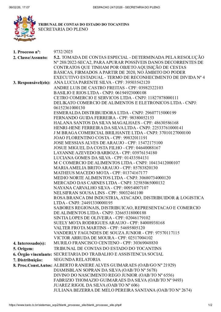 O Tribunal de Contas do Estado do Tocantins (TCE/TO) decidiu, por meio do Despacho nº 112/2026, manter o andamento da Tomada de Contas Especial que apura possíveis danos decorrentes de contratos de aquisição de cestas básicas firmados a partir de 2020 pelo Poder Executivo Estadual. A apuração envolve despesas que ultrapassam R$ 8,4 milhões, com 30 pessoas físicas e jurídicas no polo passivo, incluindo ex-gestores e empresas fornecedoras.